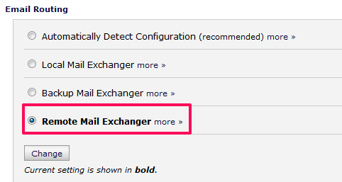 - Select Remote Mail Exchanger in the Email Routing section.Click onChange.