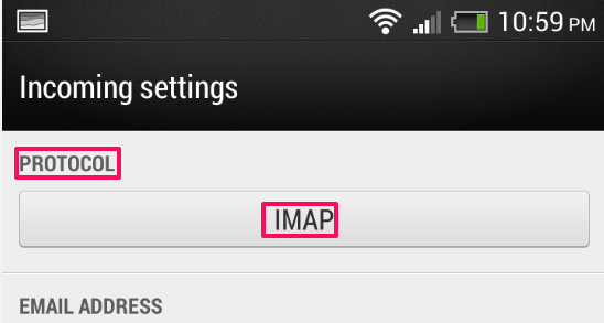 | 5. In the Incoming Settings section, ensure the following values are configured:• Protocol : IMAP • Email address : Your email address • Username : Your email address • Password: Password for the email account • IMAP server: mail.yourdomain.com • Security Type: None • Server Port: 143Tap on NEXT |